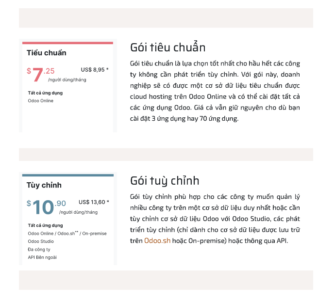 Cụ thể hơn, giờ đây người dùng không phải trả phí mà vẫn có thể được sử dụng tất cả các ứng dụng của Odoo. Tất nhiên vẫn bao gồm hỗ trợ không giới hạn, cloud hosting trên Odoo Online và bảo trì. Có hai gói định giá để đáp ứng mọi nhu cầu: Tiêu chuẩn và Tùy chỉnh. Ngoài ra, chính sách giá mới vẫn bao bao gồm giảm giá cho năm đầu tiên (hoặc ký hợp đồng nhiều năm).