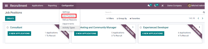 Trong Odoo, tuyển dụng là quy trình xác định vị trí công việc cần tuyển, phân tích yêu cầu công việc, xem xét hồ sơ, sàng lọc, chọn lọc và lựa chọn ứng viên phù hợp. Quy trình đầu tiên và quan trọng nhất của kế hoạch tuyển dụng là xác định vị trí tuyển dụng.