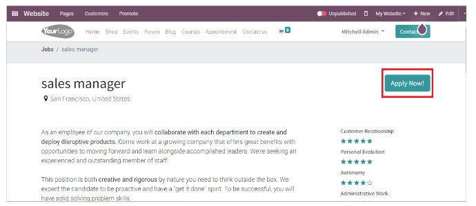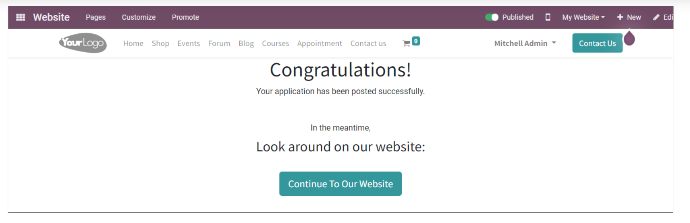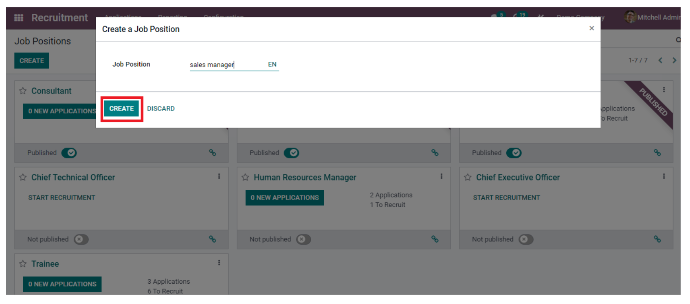 Khi chúng ta bắt đầu tạo vị trí tuyển dụng, chúng tôi có thể xem trạng thái là Đang tuyển dụng. Bạn cũng có thể xem vị trí công việc trên trang web Odoo của mình bằng cách nhấp vào nút “Go to website”.