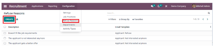 Ngoài ra còn có tuỳ chọn Refuse khi ứng viên do nhiều nguyên nhân. Chúng ta cũng có thể tạo và quản lý lý do từ chối với Odoo.