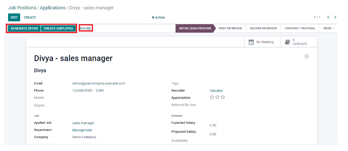 Tùy chọn Generate Offer được sử dụng để gửi thư mời ứng viên. Sau khi các ứng viên chấp thuận lời đề nghị, anh ta có thể ký hợp đồng.