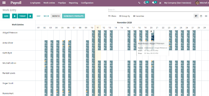 Các thông tin chi tiết về nhân viên có thể dễ dàng theo dõi, đặc biệt là trong giờ làm việc với sự hỗ trợ của Odoo. Odoo cho phép việc sắp xếp trở nên đơn giản, dựa trên dự án, ứng dụng khách hàng, nhiệm vụ hoặc bất kỳ chức danh nào khác. Để theo dõi và đánh giá bảng chấm công, người dùng có thể truy cập số liệu thống kê, kiểm tra chuyên cần của từng nhân viên. Việc đăng báo cáo tự động dựa trên dữ liệu thời gian thực về thời gian dành cho các công việc sẽ được tạo ra nhờ tính năng kế toán tích hợp trong Odoo.