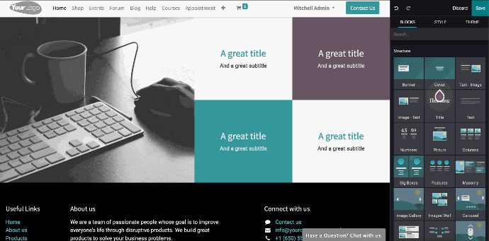 Trong Odoo v16, Website Builder sẽ có Grid layout mới. Điều này sẽ giúp bạn thoải mái sáng tạo, tuỳ chỉnh các phần tử trên webiste của mình hơn các phiên bản trước.